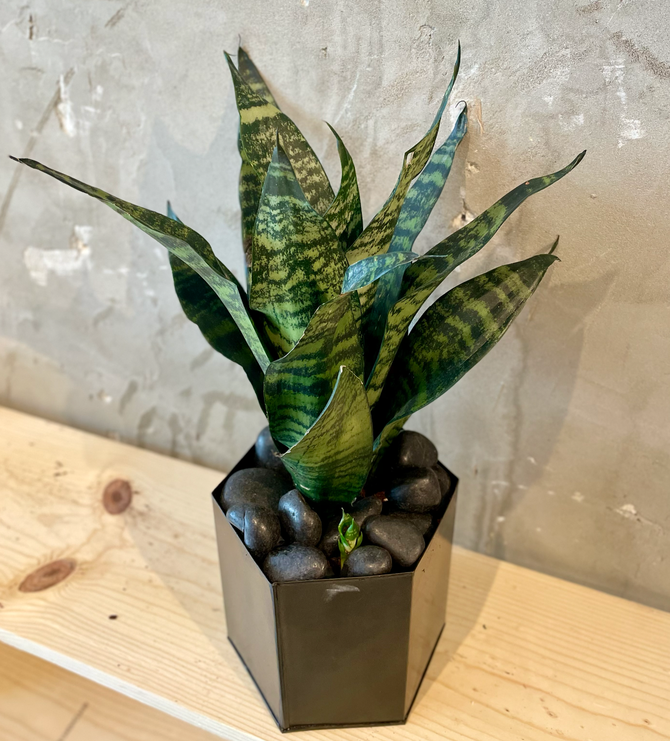 Resilient and aesthetically pleasing, the "Black Coral Snake" plant is an easy-care houseplant that features variegated foliage. Snake plants are commonly considered "hard to kill" indoor plants. Place me in bright, indirect light and water me once every two to three weeks!